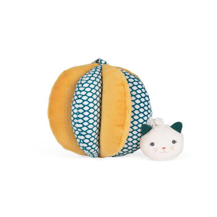 Fabricada con telas de distintas texturas, esta pelota invita al bebé a explorar a través del tacto, mientras sus colores y estampados en contraste estimulan la percepción visual. Además, incluye un simpático gatito: al tirar de él, la pelota vibra, sorprendiendo al bebé con nuevas sensaciones y fomentando su curiosidad.